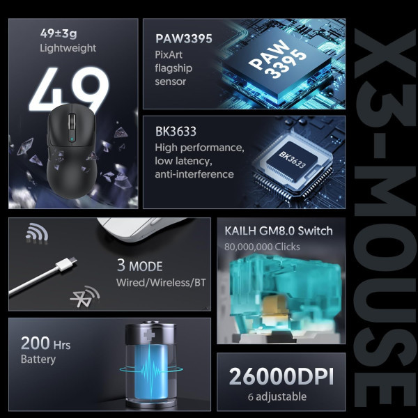 L’ATTACK SHARK X3 (Orange) est une souris gaming ultra-légère 49g avec 26000 DPI, 200h d’autonomie, capteur PixArt PAW3395 et triple connectivité pour une précision et une réactivité imbattables.