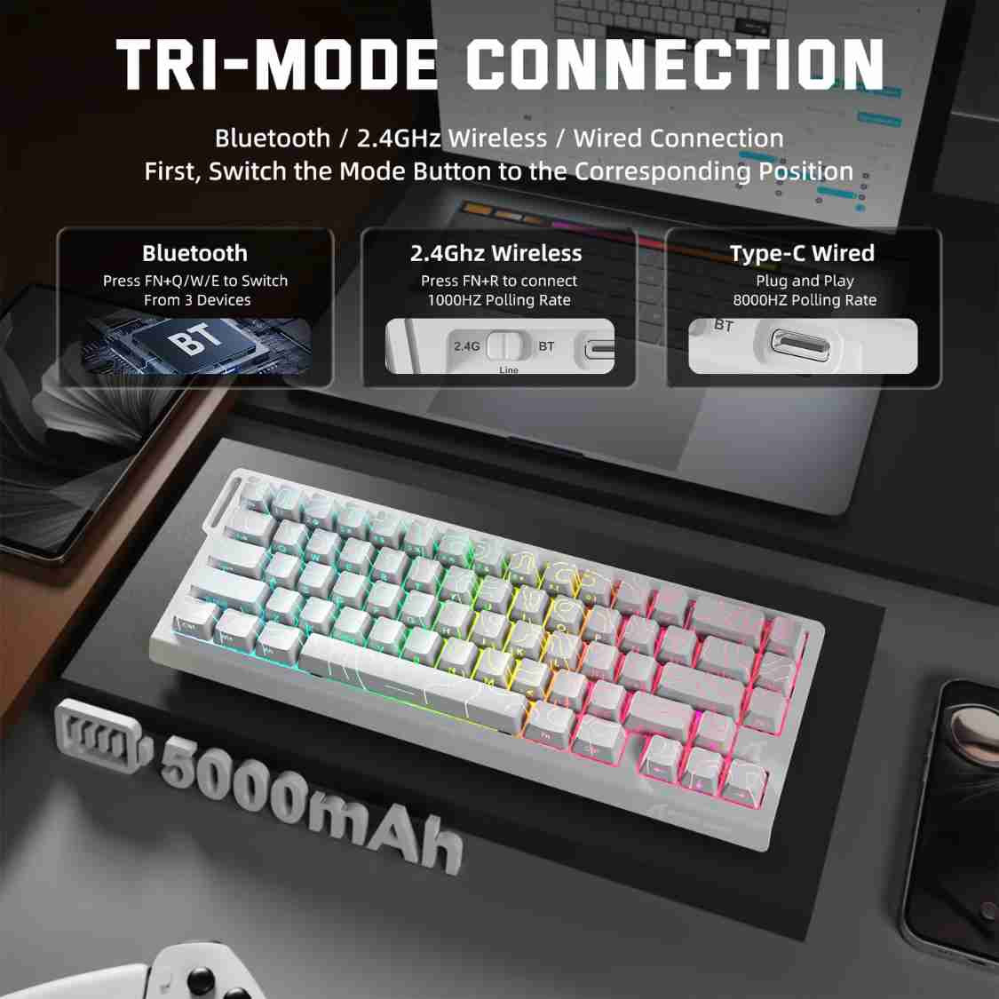 Le X68PRO HE White est un clavier 65% compact, magnétique, tri-mode, ultra-réactif (8000Hz), idéal pour gamers et pros, avec RGB 16M, keycaps PBT et batterie longue durée.