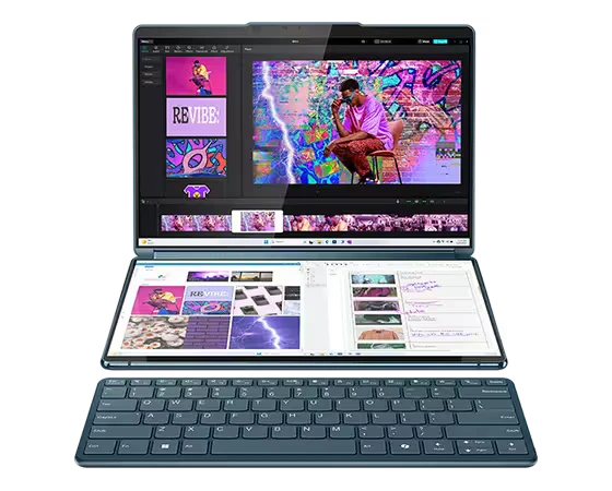 Fourni avec un stylet, une souris, clavier Bluetooth détachable et une coque folio-support, le Yoga Book 9i est prêt à vous suivre partout.