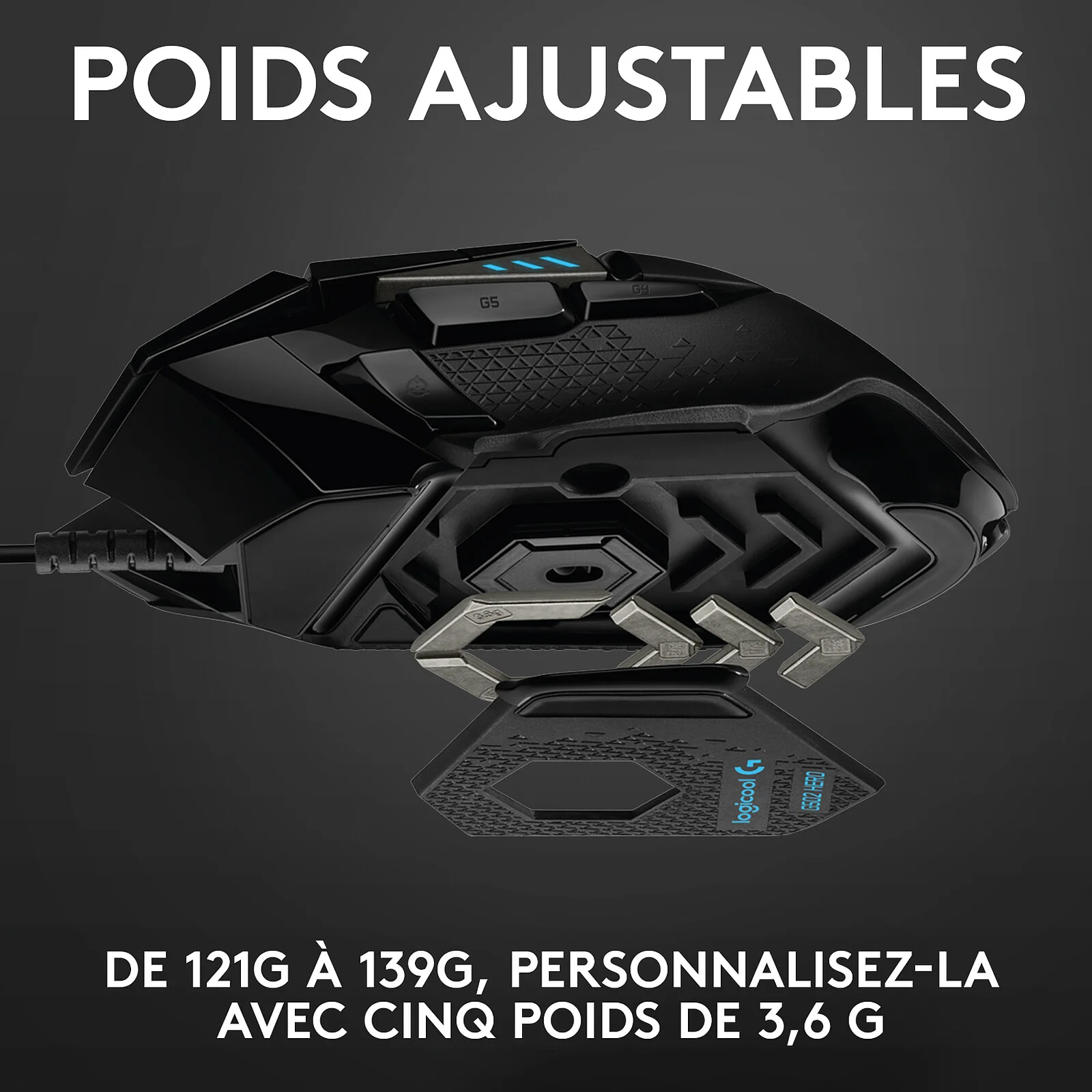 La Logitech G502 Hero dispose de cinq poids de 3.6g afin de la personnaliser à votre convenance. Utilisez-les selon le poids que vous souhaitez ajouter ou enlever dans chaque position. Cette souris peut s’adapter exactement à votre convenance.