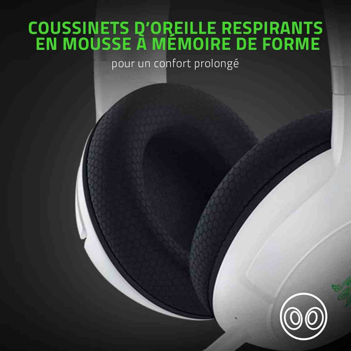 Casque Xbox sans-fil Razer Kaira blanc, drivers TriForce 50mm, micro HyperClear cardioid, coussinets Flowknit, Windows Sonic, contrôle audio sur oreillette. Son immersif, confort et performance pour gamers exigeants.