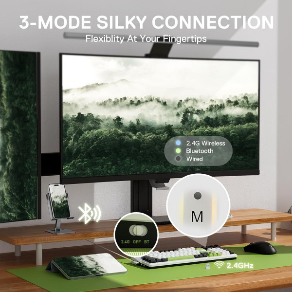 Réponse : Ce clavier offre une connectivité 3 modes (2.4GHz, Bluetooth et USB-C), une expérience de frappe fluide avec les commutateurs linéaires Mint Mambo et un design compact de 98 touches, idéal pour les gamers et les professionnels. De plus, son design avec amortissement sonore et son contrôle de luminosité à molette améliorent votre confort et votre productivité.
