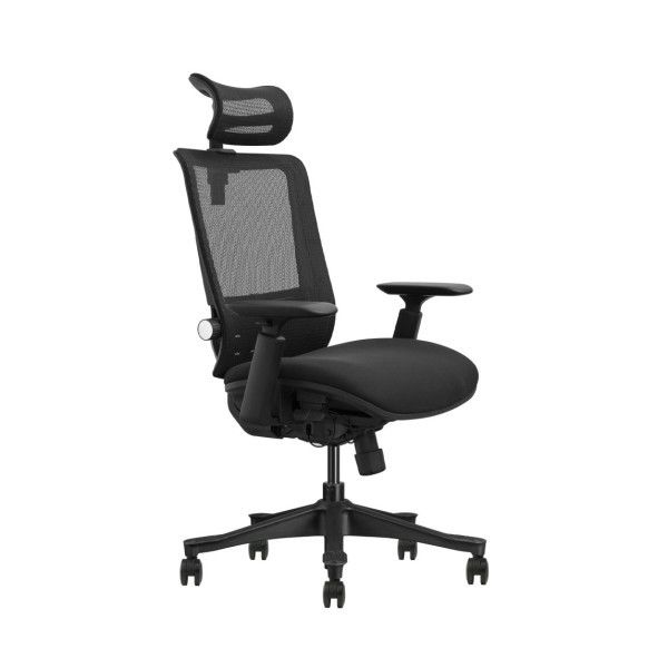 Fauteuil ergonomique en tissu et maille avec appuie-tête réglable.