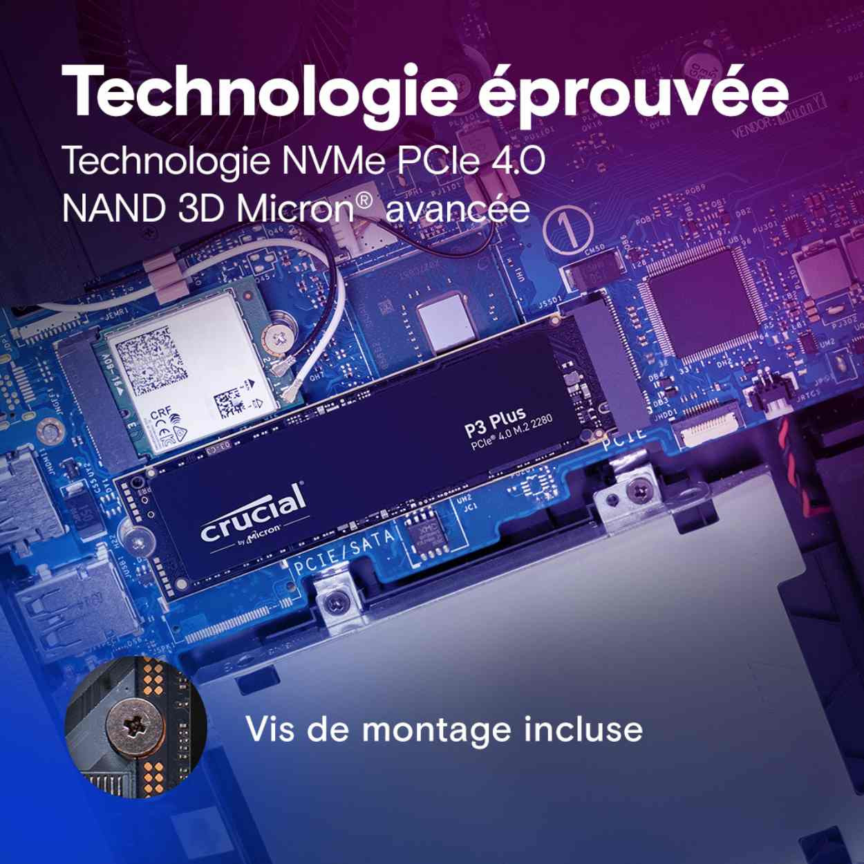 Réponse : Oui, le Crucial P3 Plus est rétrocompatible avec les systèmes Gen3 et offre une flexibilité d’utilisation, même si votre ordinateur ne prend pas en charge le PCIe Gen4. Vous bénéficiez de vitesse accrue et de fiabilité, peu importe votre configuration actuelle. Il est également compatible avec de nombreux PC portables équipés de slots M.2 PCIe, offrant une grande flexibilité d’installation.